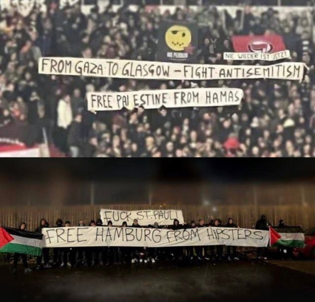 The conflict between international football clubs can be summed up in two different banner displays from FC St. Pauli and Celtic FC (a Glasgow, Scotland based team with an infamous history of rowdy anti-fascist supporters, the Green Brigade) during October 2023. The Green Brigade has a long history of showing support for anti-fascism, anti-colonialism, and rebel causes like the Irish and Palestinian liberation struggles. Ultras St. Pauli (USP) displayed banners at one game reading “From Gaza to Glasgow – Fight Antisemitism. Free Palestine From Hamas.” The banners’ messaging is clear – the main issue at stake in Gaza is not the colonial occupation of the Israeli state, but antisemitism, which USP claims is present in Glasgow as well due to the Green Brigade’s support for Palestine. Conflating anti-Zionism with antisemitism is an old trick that has been debunked by anti-fascist activists countless times over the years. Additionally, USP identifies that the political party responsible for corruption and violence in Palestine is not the Israeli state, but Hamas. USP’s propensity to side with the colonial state of Israel is implicit in these banners. Celtic FC supporters responded with banners of their own, reading “Fuck St. Pauli. Free Hamburg From Hipsters” accompanied by two Palestinian flags.